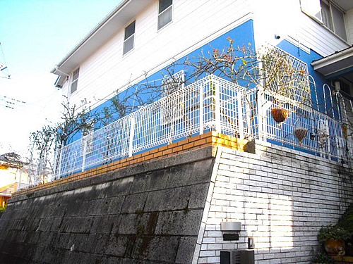 ブルーの建物外壁にホワイトカラーのメッシュフェンスで陽当たりと風通しと安全な作業と、今回フェンスの設置で3つの安全が確保されました。