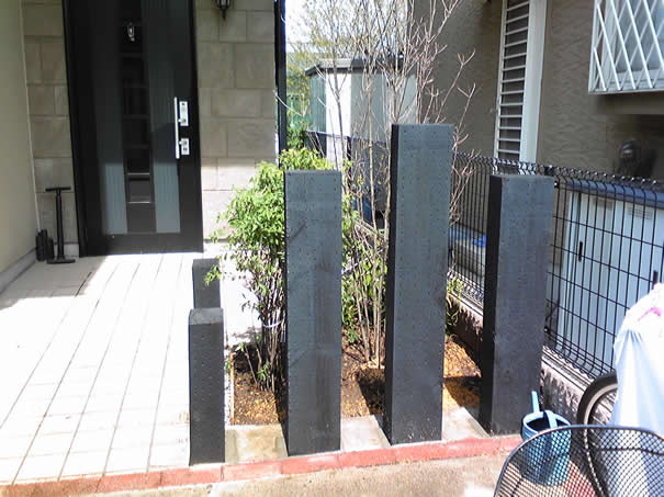 D.I.Yがお好きなご主人様と、お洒落でモノトーンカラーがお好きな奥様。建物の外壁塗装を塗り直し、白いコンクリート土間に、黒い坑木をランダムに用いて、モダンモノトーンを演出しました。今まで花壇として使用していたインターロッキングブロックも、坑木の間に花壇の土留めと坑木の基礎の深さを確保するのに役立っています。景石はすべて新たなラインで据え直し、玄関右脇アプローチには、坑木と塗装板で土留め・花壇を施しました。坑木も経年変化で朽ちて、いずれ交換時期が訪れるので、コンクリート基礎と部材との隙間には、珪砂(けいしゃ・細かい砂)を用いて、天端はモルタルの上塗りを薄くかけ、容易な交換を可能にし、雨天や灌水時の珪砂流出防止対策を施しました。