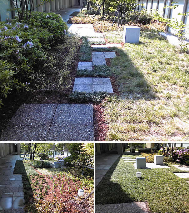 建物の南側に位置するエントランスで、陽あたりが良すぎて、客土の畑土より雑草が一面を覆っていました。一部の植栽地では、建設時からの床下地が全てコンクリートのスラブ打設のため、排水ルートがない状態でした。陽あたりが良く、灌水システムが設備されていない場所でしたので、植物に根腐れが及ばぬよう改良し、保水性を高める施工が要求されました。