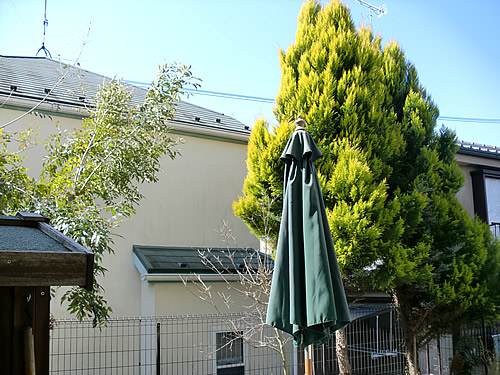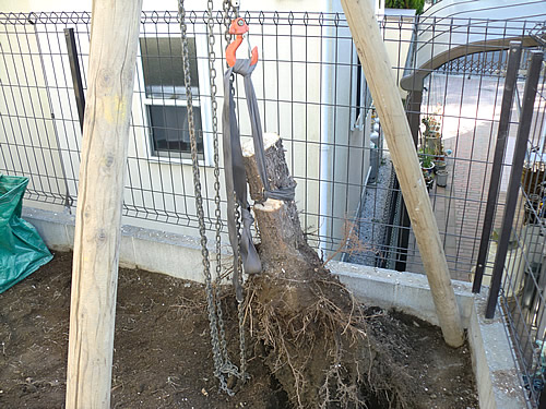 下枝のみを定期的に切除されてきたコニファーは、樹高が著しく高くなり幹の成長も盛んで敷地境界付近に在る既存メッシュフェンスを曲げてしまっていました。
