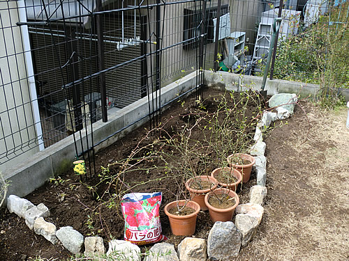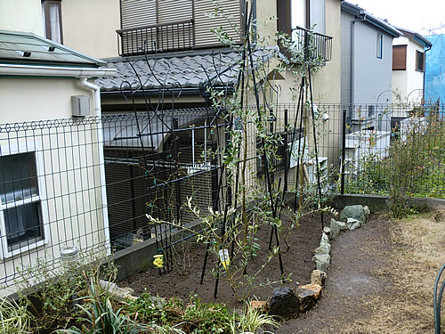 モッコウバラと3種類のオリーブが地に馴染んで近い将来、落ち着きのある優しいお庭を演出してくれることとおもいます。