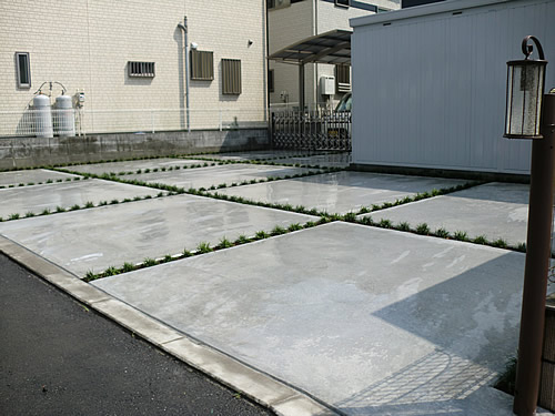機能としましては、コンクリート伸縮によるクラック(小さなヒビ割れ)の防止効果や、雨水や洗車時の汚水表面排水の向上、雑草の植生防止、駐車スペースの轍防止、周辺近隣道路へのタイヤ痕付着防止、真夏日の照り返しの減少、植物に灌水すると同時にコンクリート面への打ち水効果、などに役立ちます。