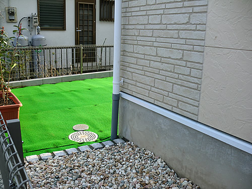 お庭の芝生でお子様が安全にお遊びになりたいとの御希望と、土壌の搬入出を最小限に抑えてコストを抑えた施工方法。今回は全て考慮した上での人工芝貼り施工となりました。編み込み式のPPポリエチレン芝で弾力性があり、裏面貼込部分には滑り防止機能があります。目隠しを兼ねての植栽はプランターで補い、建物への泥はねが抑えられます。