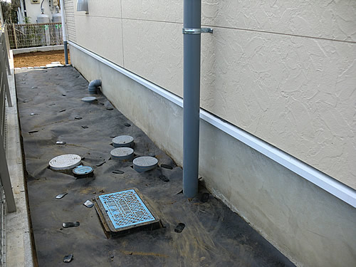 建物2F部分には南側へバルコニーが張り出した構造で、その直下の土壌は建物基礎との兼ね合いもあり、ドライエリアとなっておりました。