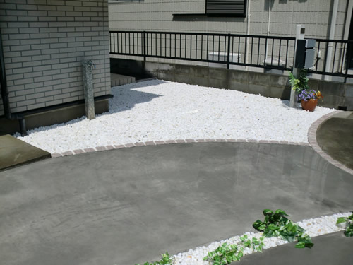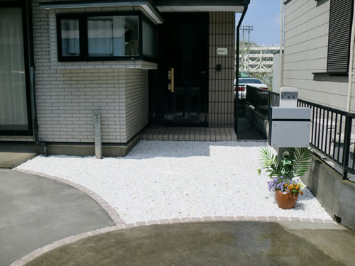 お庭全体が明るくより広く感じられるようにと、雑草対策としまして防草シートと白化粧砂利を二種類使用しました。奥の和室前スペースには白玉化粧砂利、玄関前スペースには足音が出やすく防犯を兼ねた角付白化粧砂利。