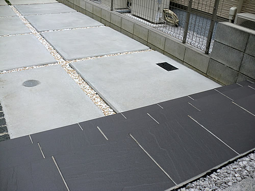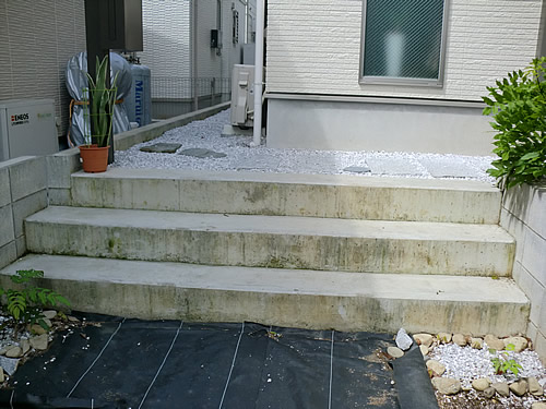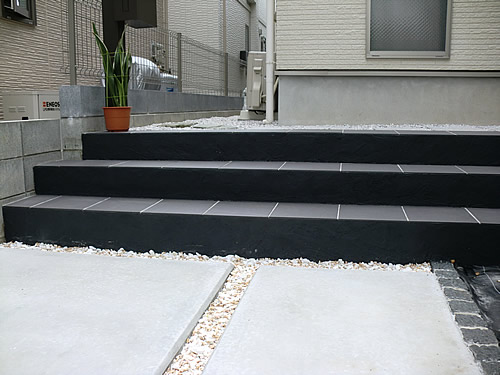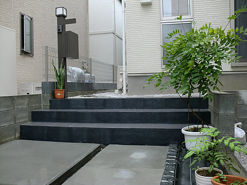 土間表面排水を所定勾配(傾斜)で設計しますと、階段の蹴上(階段1段目の高さ)に変化が生じます。毎日の生活動線としましては使い勝手の良い階段に造り変える必要があります。また使用します石材や上塗材などでアプローチの印象が大きく変わります。