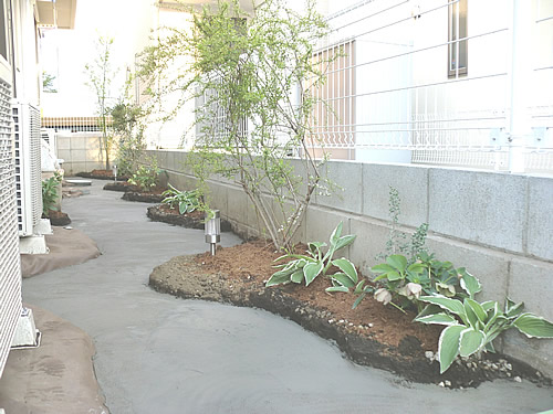 これを無理に植え込みますと近い将来には樹木の進根で埋設管を傷めたり、樹木の生育不良を引き起こします。防根(耐根)シートなどで埋設配管を覆い、盛土でガーデンエリアのGL(グランドレベル)を上げて植え込みます。