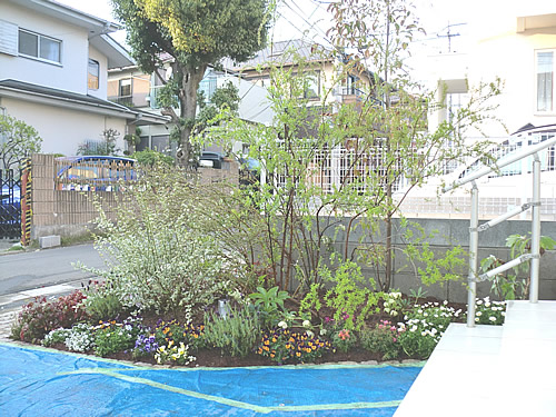今年の3月よりアプローチプランニングを開始。丈夫に冬超してきた花達を交えながら新しい庭園樹で動きや高低差を出し、南西玄関アプローチ周辺は西日が強く、丈夫で隣接住宅の方へ御迷惑の掛かりにくい樹形や生育樹を。