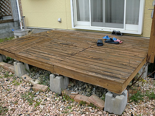 いつからか、デッキは朽ちて腐食し、雑草が蔓延ってしまいました。また、カラー平板やレンガ、花壇などの既存石材は出来る限りで再利用して頂けたら嬉しいとの御依頼でした。