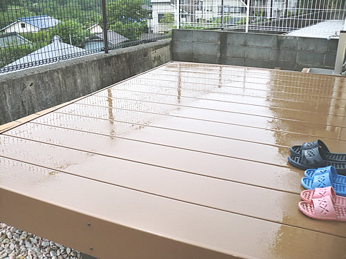 ウッドデッキに関しては今回、人工木材製品を使用させていただきましたが、従来の製品と比較しますと強度や耐久性も向上しておりますが、夏期でのデッキ表面温度が格段に軽減(約8〜10℃)されております。
