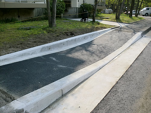 こちらは特に勾配が緩やかな箇所へ、両サイド透水性のスラグ舗装で排水効率を高めております。