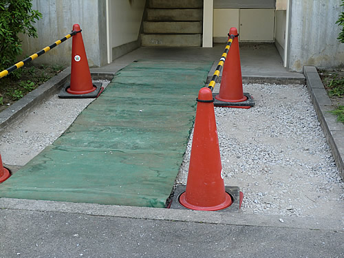 アプローチコンクリートと居住区の入口乗り入れ部では段差がありました。段差を解消するよう緩やかなノンスリップコンクリートスロープへと変更しております。