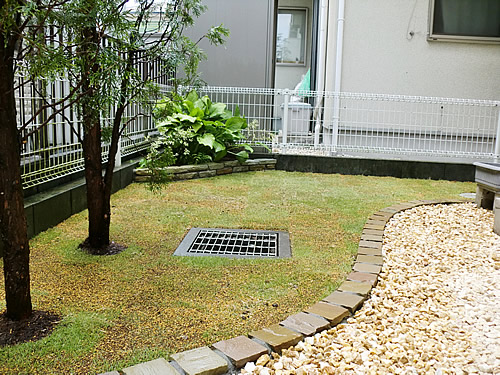 もう一度、芝地の面積をいまより小さくして日本の芝生を楽しみたい。その他の場所は、ローメンテナンスで明るいお庭にしたいとのご要望です。