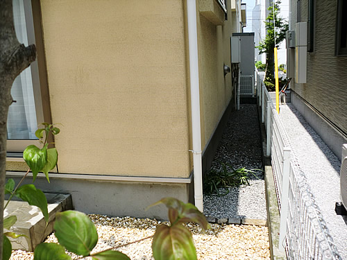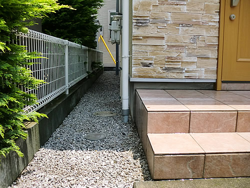 ・防草シート敷設(ザバーン社製)+化粧砂利(イエロー・クラッシュタイプ15-25mm)敷き