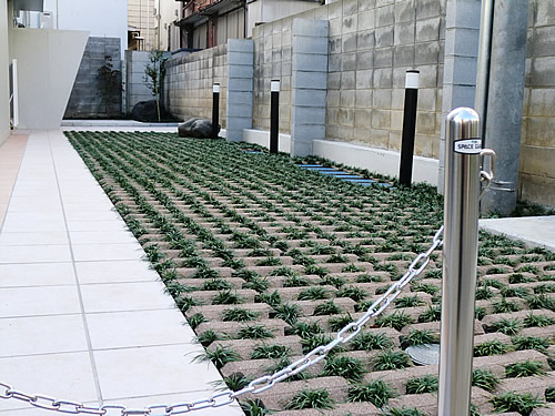建物北東側には、一定の緑化面積を確保し夏の照り返しを防ぐ緑化ブロック内へ地被類を植栽。