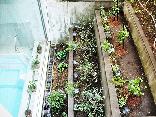 バックヤードテラスガーデンは地下1.5Fより地上1Fまでを4つの土留めコンクリートでガーデン区画されたエリアで構成されています。初回調査では、各段PH値、水分含有量を測定。最下段エリアは、水の浸透及び排水設備を確認しました。