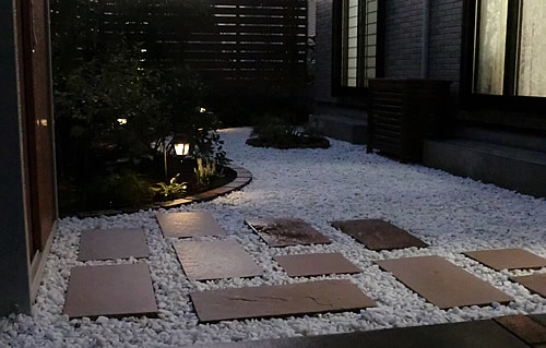 夜はLEDライトの優しい電球色で、住まう人へ安心と安全、安らぎを与えます。昼間の明るい印象とは違う、ナイトガーデンも魅力です。