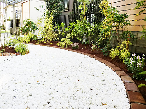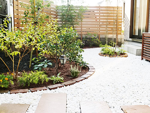 オープンスタイルのガーデンは優しいゆるやかなレンガカーブで雰囲気を生み、広めに確保のできた化粧砂利空間へアクセントでツリーサークルを設置しました。