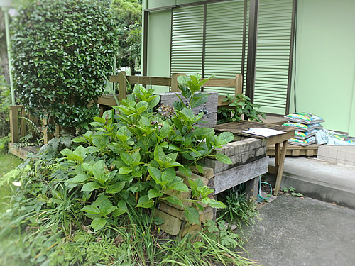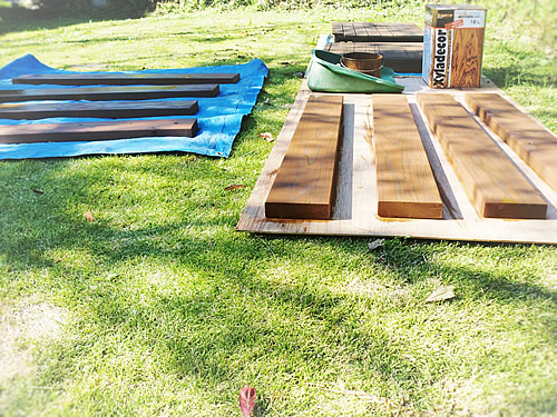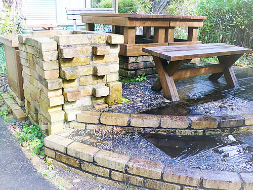 ・ガーデンテーブル天板交換塗装、ウッドポンプカバー塗装、ウッドベンチ塗装(エステックウッド材、オイルステイン防虫防腐塗装)