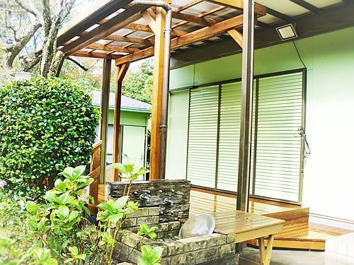 ・天然木パーゴラ屋根造作(イペ材+ポリカ材)