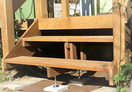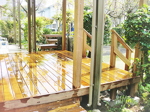 今回、朽ちたデッキ部分改修工事では安全の保障が出来にくい状態でしたので、ウッドスペースさんご協力のもと天然木ハードウッドデッキを全改修工事で新たに長く安全にご利用していただく運びとさせていただきました。