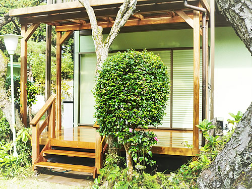 ■今までも丁寧にメンテナンスを施しながらご利用されてきた天然材ウッドデッキ。夏の床温度が低く、冬にも見た目にも自然の木でぬくもり感がございます。