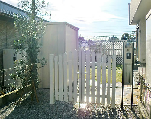 今回は樹冠の整ったオリーブの木をアメリカン門柱脇に植えることで、やわらかな視覚での人留め効果と、電気引込柱や物置の硬いイメージを遮っています。