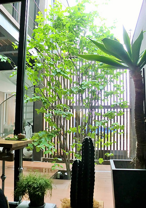 サロン内へとつづく木漏れ日の光。 ゆっくりと流れる時間を、穏やかな気持ちで身を任せるスペースです。