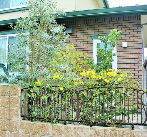 建物壁とブラウンブロックに映えるオリーブの葉色、色鮮やかなカロライナジャスミンが、春の香りを届けてくれます。