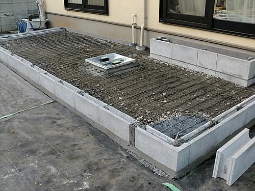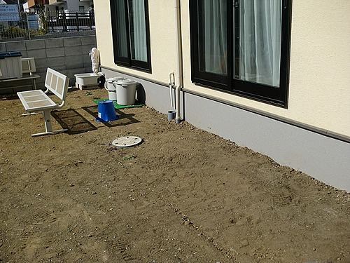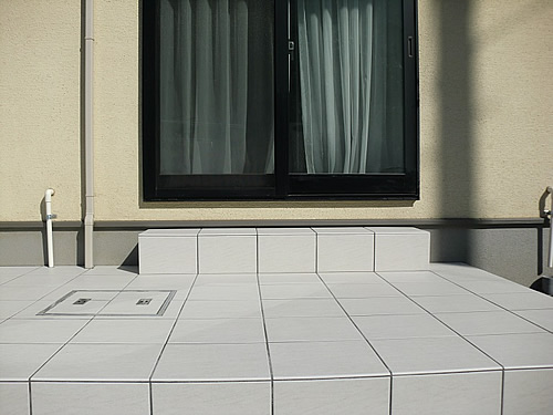 今回は、建物南向き掃き出し窓からの出入りを容易に使い易くするために、ロータイプのタイルポーチを造作しました。
