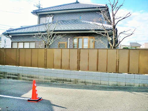 元々のブロックフェンスは、昨年秋の大型台風の強風にあおられ、倒壊してしまいました。また幸いにして建物側に押し付けられ、しっかりした樹木があったので、幹へ寄りかかるカタチで倒れていました。