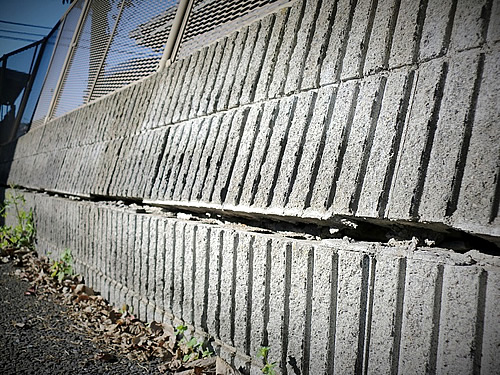 ブロックの部分撤去前の目視による点検でもブロック段数からの控えブロックは無く、笠木ブロックの破損や、大きなクラックや破損、傾きなどが生じておりました。