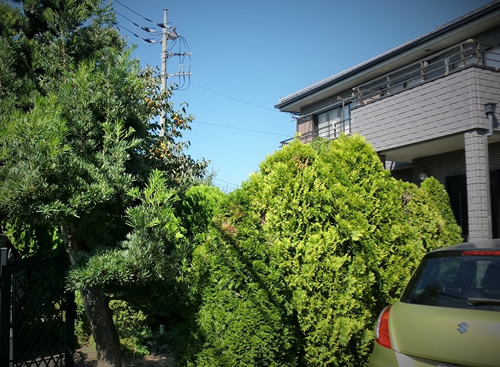 コニファー類の場合、葉の外側を刈り込み樹形を整えることが多く見受けられますが、結果として徐々にトップヘビーとなり、浅根性のため、倒れ易くなります。