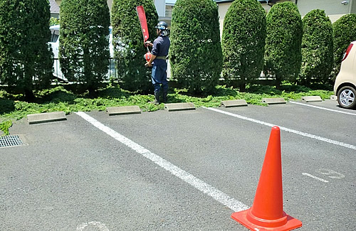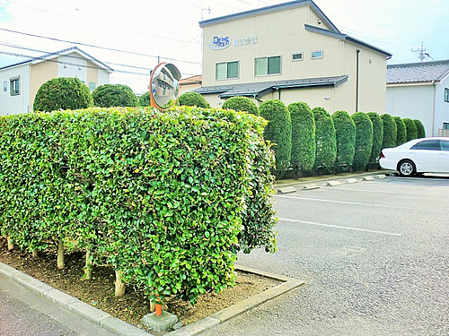 また駐車場に列植されています針葉樹のカイズカイブキは大きく成長し、樹木内へハチの巣がつくられ、南側の隣地内まで枝葉進入しておりましたので、事前のお知らせによるお車移動や、移動困難車両への不織布養生と、安全な手作業剪定と機械刈りを併用しながら樹形を整えました。