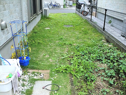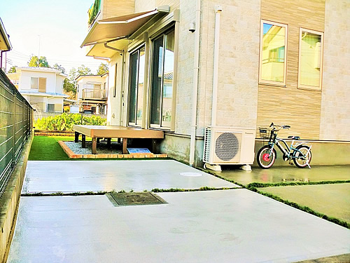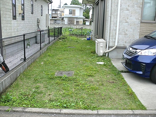 元々のお庭はメッシュタイプフェンスで囲まれ、天然芝(高麗芝)が全面に貼られておりました。また玄関前スペースへは、平板や砂利玉竜で構成され、小さなお子さまの歩行時には、多少のつまずきや転倒などの危険なリスクも御座いました。