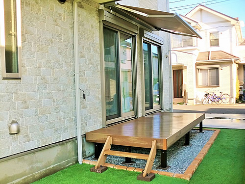 設置に関しましては普通車の全長5mくらいまでが安全に駐車できますよう、ウッドデッキを奥側へセットし、上部へオーニングをバランス良くセットし、夏季対策と同時にナチュラルカフェのようなオシャレ感が演出されました。