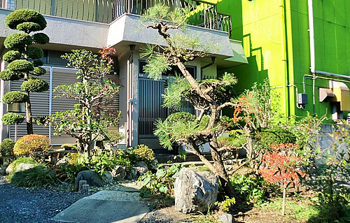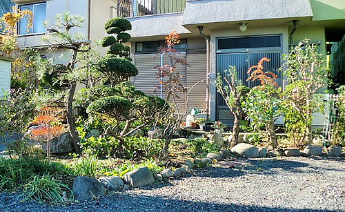 華道師範の奥様が手掛ける椿や下草などは数多く、ご自宅内で様々な植物が随所に植えられております。またこの季節はご主人様の本格的なご趣味を生かし、ナラの原木を使ったしいたけ栽培もお庭の中で観られます。