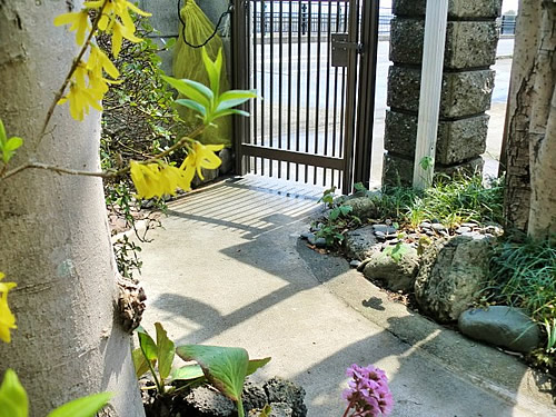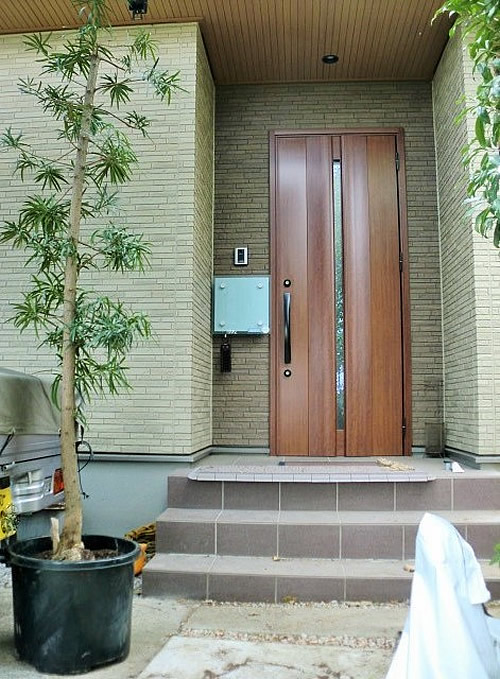 ◆ 玄関サイドに植えられた槇の木。ガスの交換や建物脇を通る際に干渉がお困りでしたので今回、時期の良いタイミングで移植、新たにセットバックしスリムな斑入りマサキを植えて玄関サイドのプライバシ確保としました。