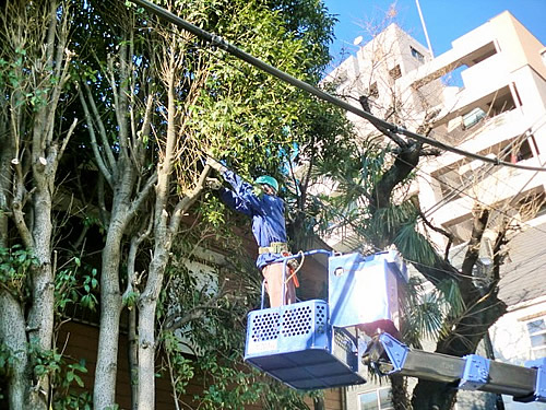 今回は奥地への引き込み電線や各種ケーブルに絡んでいる枝葉も多数ございましたので、危険な電線まわりににつきましては、練馬区らいふさぽおと様ご協力の元、東京電力さんとのコラボレーション作業となりました。