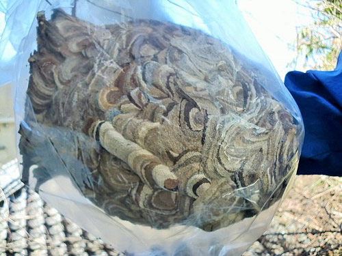 また今回は主に高所作業となり、10m以上のサクラやカシの大木類、建物2階の軒下に大きなスズメバチの古い巣や、常緑樹の大径枝も多数ございましたので、高所作業車と登り込み作業の両方で対応させていただきました。こちらも朽枯しやすい樹種や大きな枝のカット後には殺菌剤を塗り、樹木のダメージを最小限に抑えます。