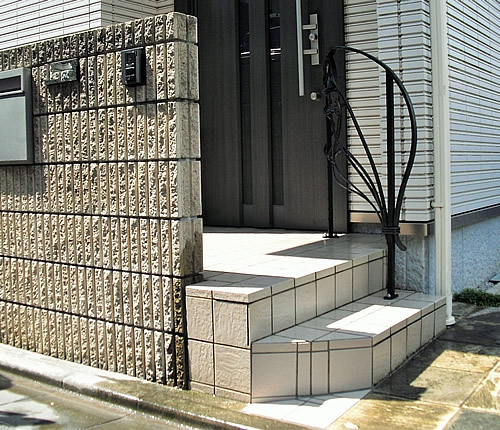 はじめにいくつかのエクスステリアカタログよりご提案させていただきましたが、お話しをしているうちに玄関へ少しフォーカルポイント(人々の視線を自然に誘導するポイント)となるようなイメージ、優しくオシャレな手摺りもいいな。とお話しをいただきました。