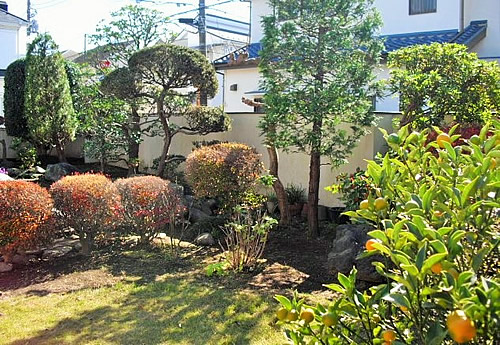 外観はプライバシー保護の常緑樹や針葉樹をメインに、お庭へ入らせていただきますと四季を感じる様々な木々や果樹もあります。