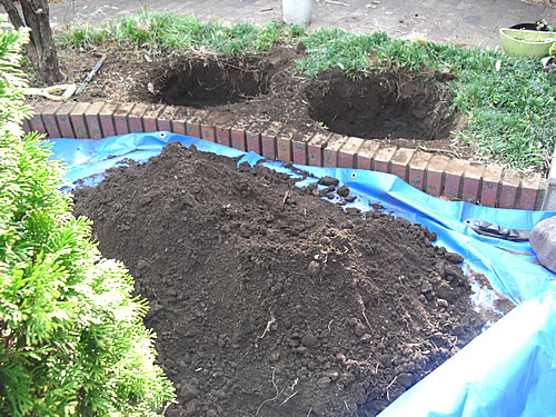 ◆ また同様に、昨年秋の強風によりコニファー2本が倒木してしまい、起こし支柱を設置していたのですが、根の枯損が激しく、衰退してしまいました。