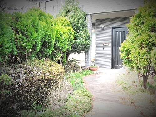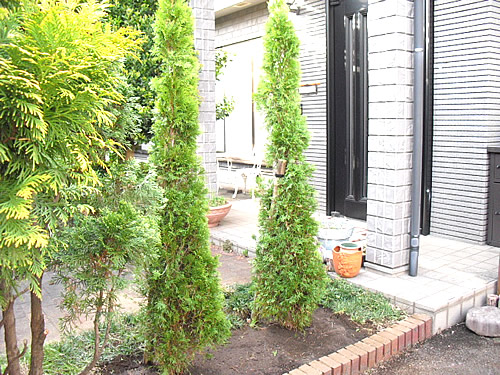 今回、ヒメシャラ枯損木は伐採、抜根除根させていただき、元の花壇へ戻し花物スペースといたしました。 また同様に枯損してしまったコニファーは、伐採、抜根除去をさせていただき、新たなコニファー ・エメラルドグリーンを、アプローチ植栽いたしました。