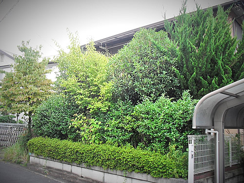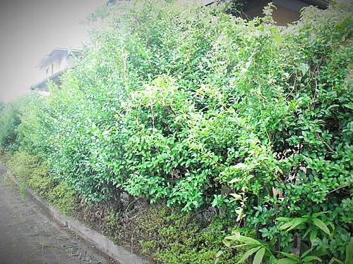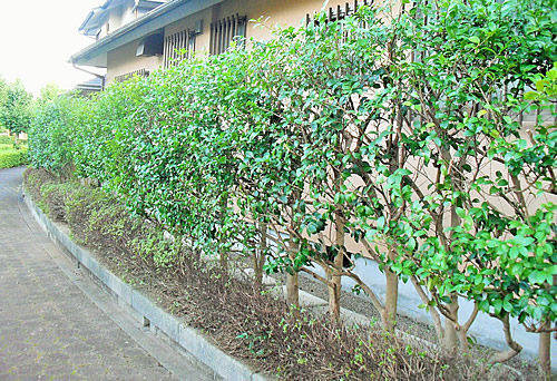 また数年間にすっかり込み合ってしまったサザンカ生垣には、ドクガ類のチャドクガという毛虫がついた跡も見られました。 (主に4〜5月と、8〜9月頃、集団で葉裏に潜んでいて葉を食害してしまいます。また危険な毒針を持っていますので人が触れますと激しいかゆみや皮膚炎を起こします。)