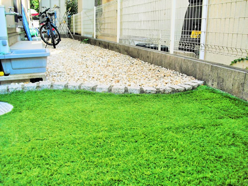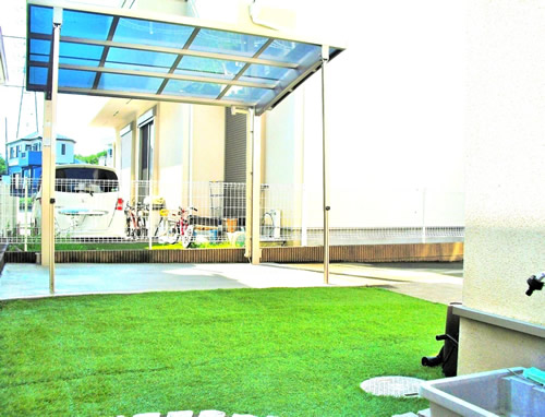 9年前の当時に施工させていただきました、「リアルタイプ人工芝や防草シート」は、エクステリアメーカーの中でも良質な品をお選びいただいておりました。