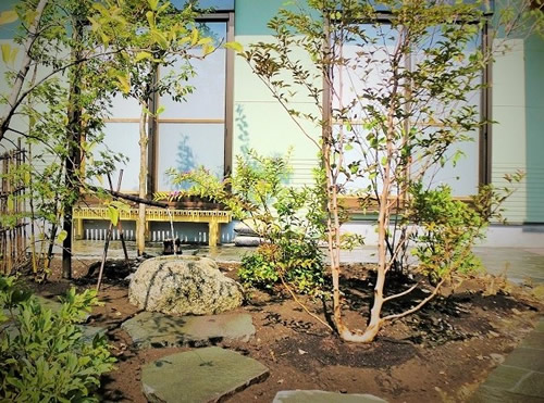・樹木植栽(ツバキ、ワビスケ、カンツバキ、ベニシダレモミジ、コハウチワカエデ、サルスベリ、ヒメシャラ、ミツバツツジ、ニシキギ、アセビ、クロチク、フイリヤブラン、ツワブキ、タマリュウ、コクリュウ、アジサイ)