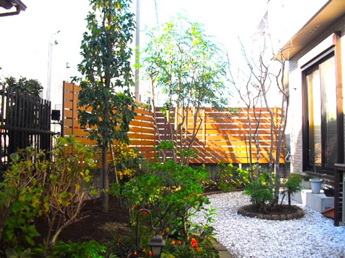 大きく立派に成長した高さのあるプライバシーツリーのシマトネリコや、綺麗な白花の常緑ヤマボウシ・ムーンライトも手間も掛かりにくくひとつの魅力的なお庭です。