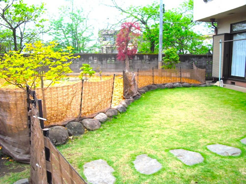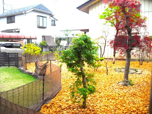元々のお庭は日本芝と盆栽がメインです。また庭木はカキの木、ミカン、ユズなどトゲの多い木が多く、アブラムシやカメムシの発生も多く御座いました。