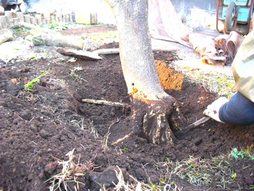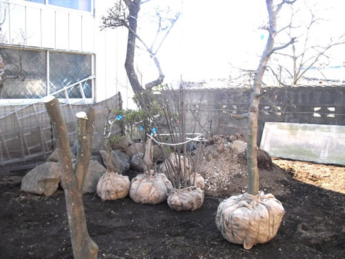休眠期から水揚げ早く表皮の薄いカエデ類などは幹巻きを施し寒さ対策をしながら、出来ます限り細根を残しつつ根巻きを施します。